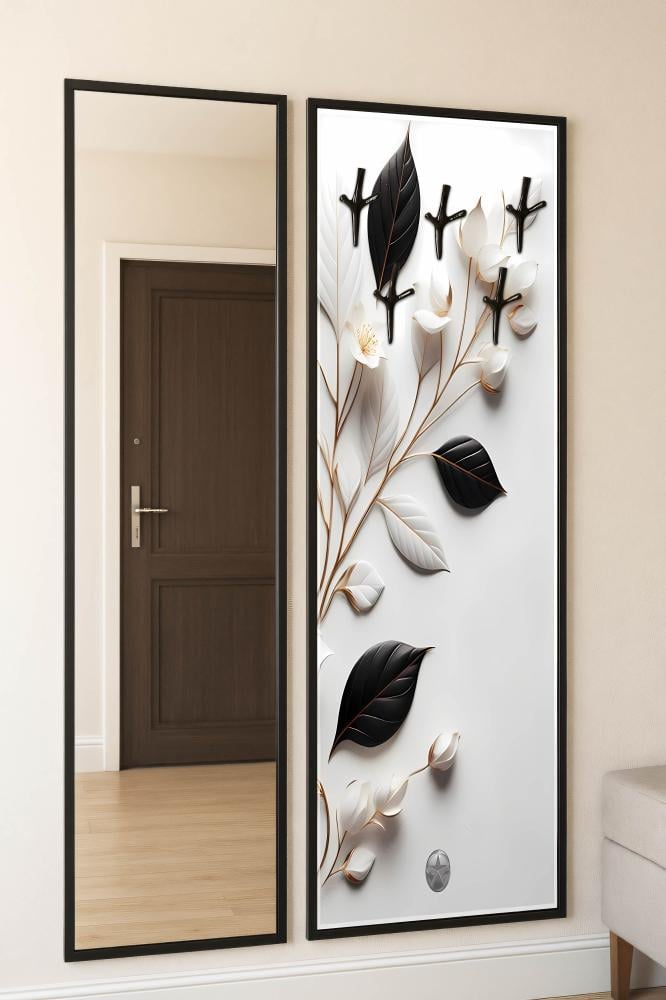 لوحة فنية مصنوعة من قماش الكانفس، تحتوي على 5 علاقات معدنية أنيقة لتعليق الأغراض اليومية، وتأتي معها مراية منفصلة تكمل الوظيفة والجمال. مثالية لترتيب المداخل بطريقة عملية ولمسة ديكورية راقية.