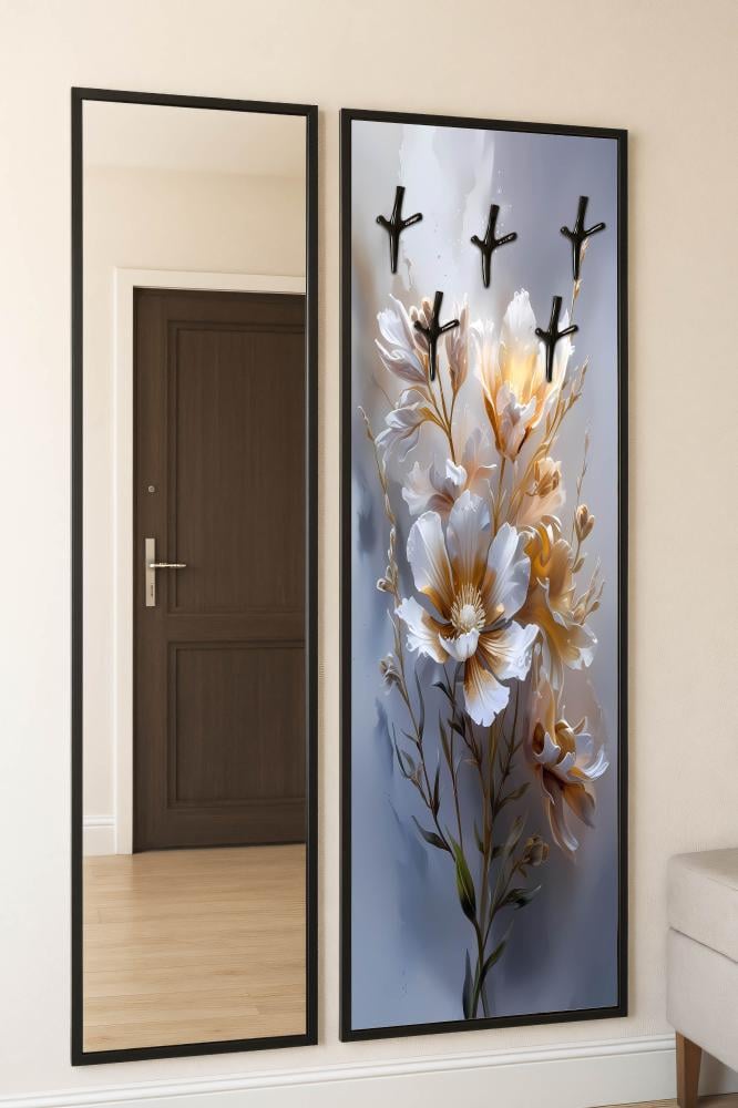 لوحة فنية مصنوعة من قماش الكانفس، تحتوي على 5 علاقات معدنية أنيقة لتعليق الأغراض اليومية، وتأتي معها مراية منفصلة تكمل الوظيفة والجمال. مثالية لترتيب المداخل بطريقة عملية ولمسة ديكورية راقية.